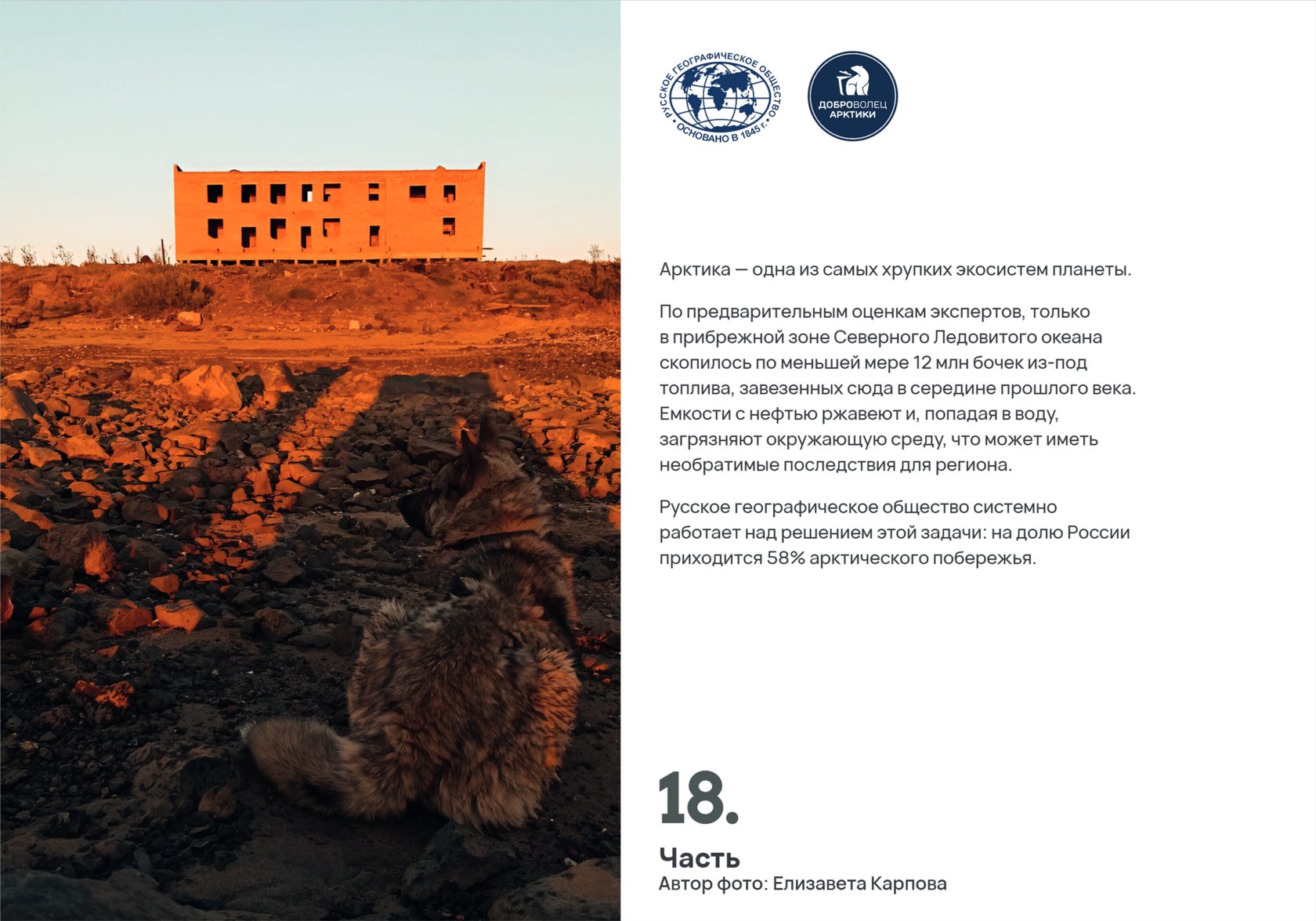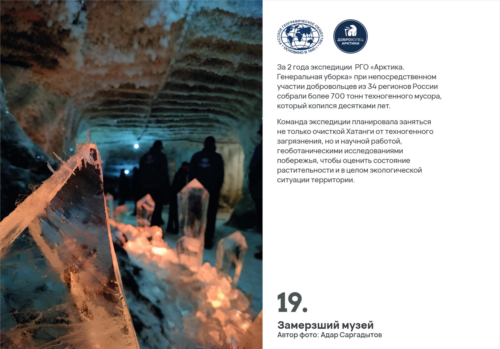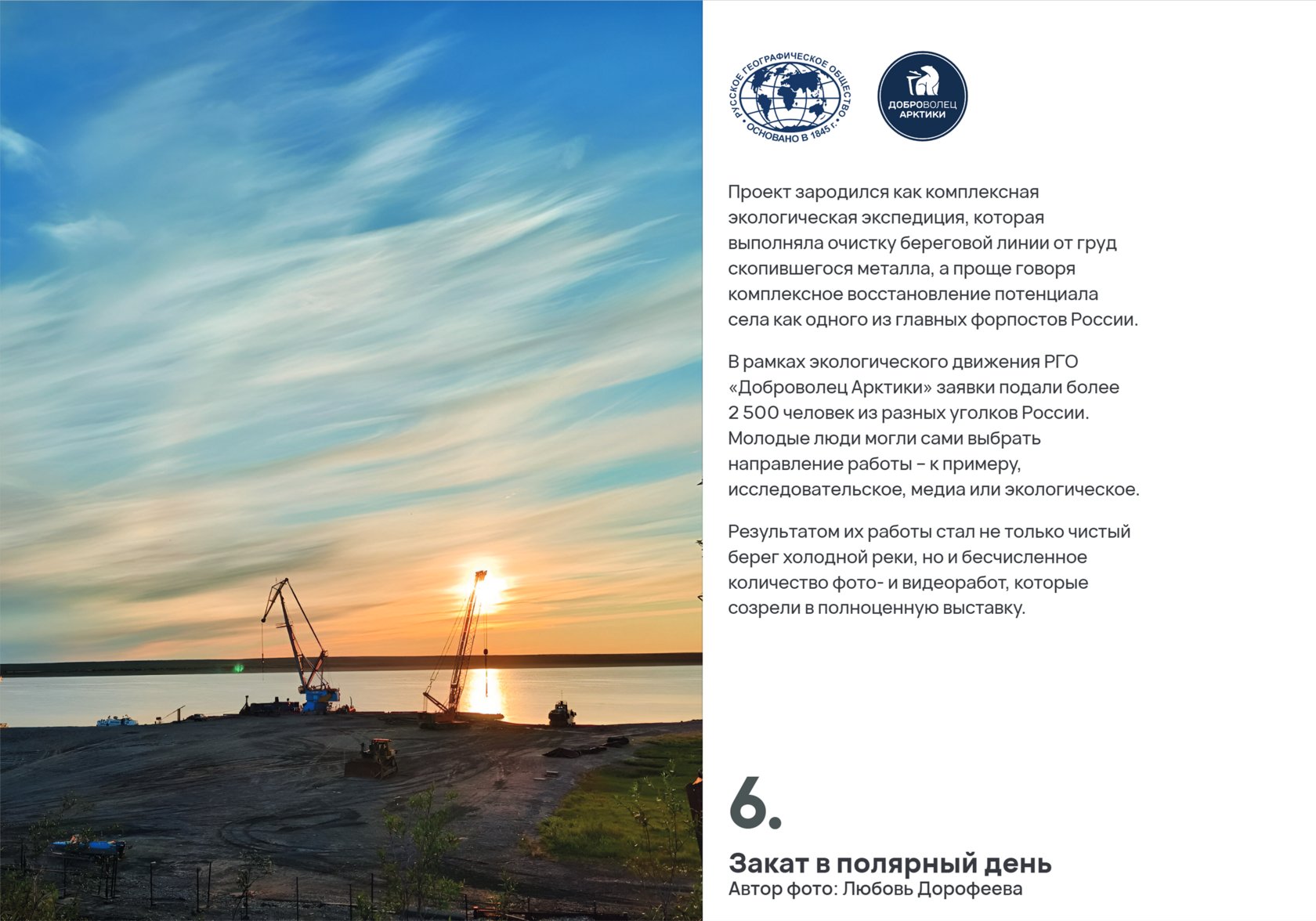 «Хатанга. Наследие» — это большой просветительский проект, который включает в себя фотовыставку с интерактивными экскурсиями, серию видеороликов и подкастов. Он зародился как продолжение комплексной экологической экспедиции Русского географического общества «Арктика. Генеральная уборка», в рамках которой велась работа по очистке береговой линии от груд скопившегося металла и комплексное восстановление потенциала села как одного из главных форпостов России.